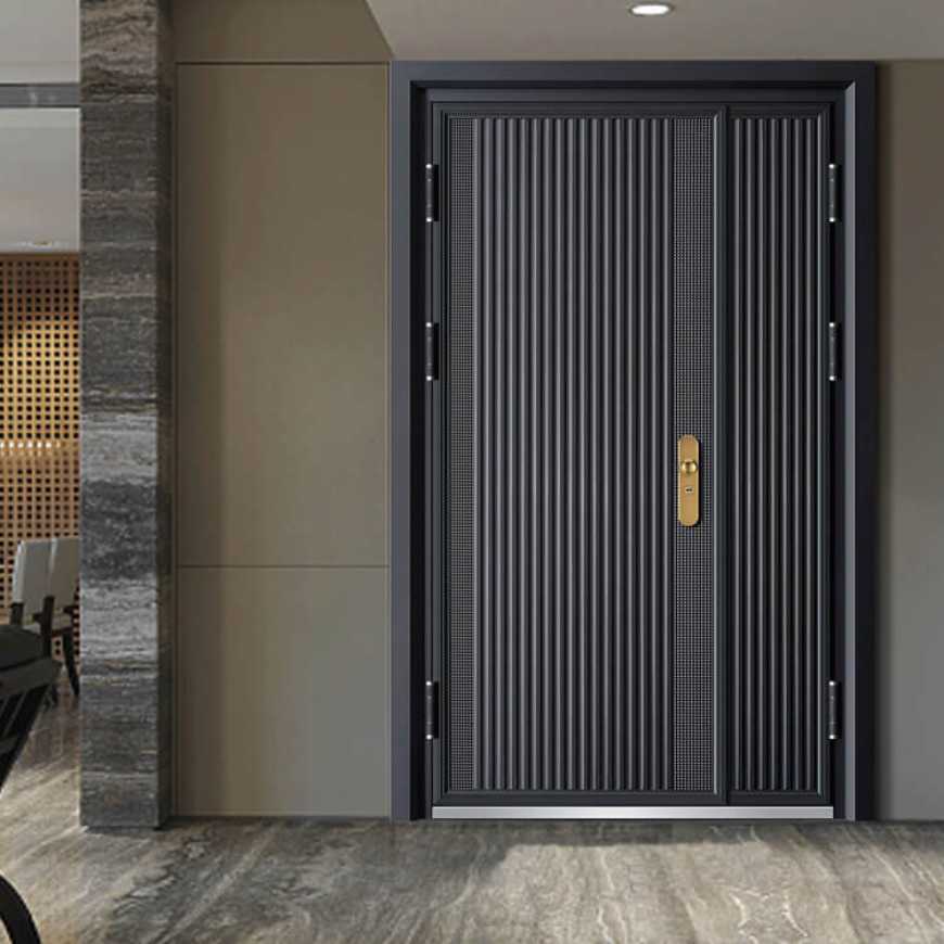 Made with premium Galvalume steel, these doors are reinforced with double steel panels and a core filled with Rock Wool or Honeycomb material, offering superior insulation against heat, sound, and termites.Equipped with a multi-point, multi-position lever lock system, including sawing-resistant lock points for maximum security and peace of mind.